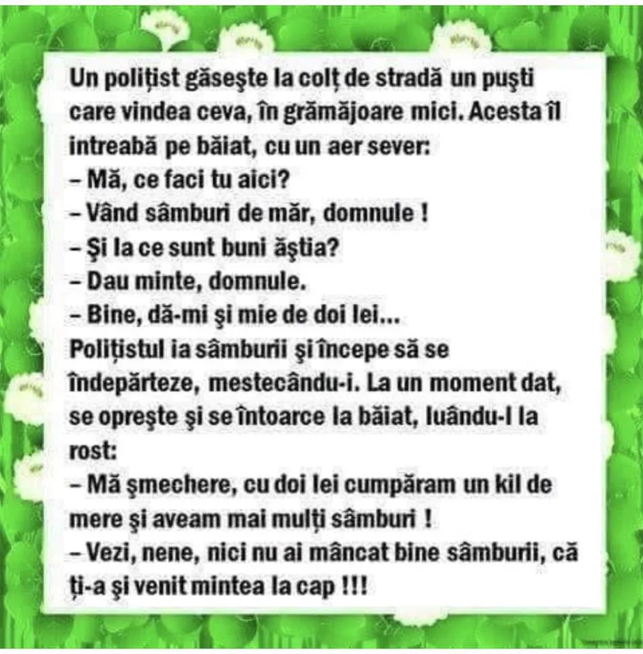 Nici astăzi zâmbetul nu trebuie să lipsească de pe buze. Așa că am pregătit un banc foarte amuzant. Vezi în ce situație haioasă ajung en copil care vinde sâmburi de măr. Voie bună și spor la râs!
