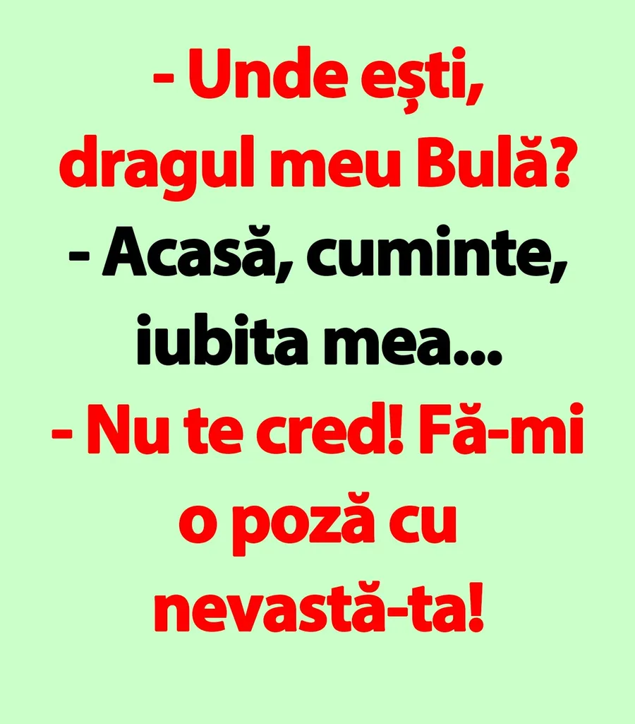 Ziua bună se cunoaște de dimineață și trebuie începută cu zâmbetul pe buze. Iar pentru asta am pregătit un banc care cu siguranță te va amuza copios. Protagoniștii de astăzi sunt Bulă și iubita sa. Deznodământul este hilar.