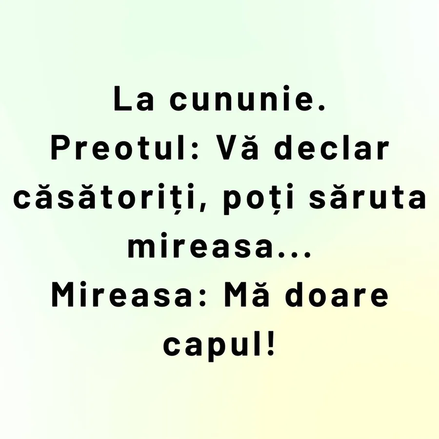 Dragă cititorule, în această seară, CANCAN.RO ţi-a pregătit un banc excepţional care te va face să râzi în hohote. Protagoniştii sunt un cuplu care abia s-a căsătorit. Prima reacţie a miresei te va da pe spate!