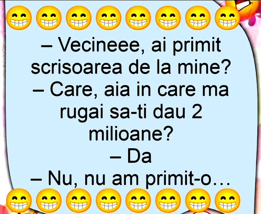 Dragi cititori, CANCAN.RO vrea să vă aducă zâmbetul pe buze în această zi de marți, așa că vă pune la dispoziție un banc amuzant. Un bărbat îi trimite vecinului său o scrisoare controversată. Pentru a se asigura că a luat aminte de dorința lui, și-a întrebat vecinul dacă a intrat în posesia bilețelului. Răspunsul celui din urmă te va face să râzi cu lacrimi!