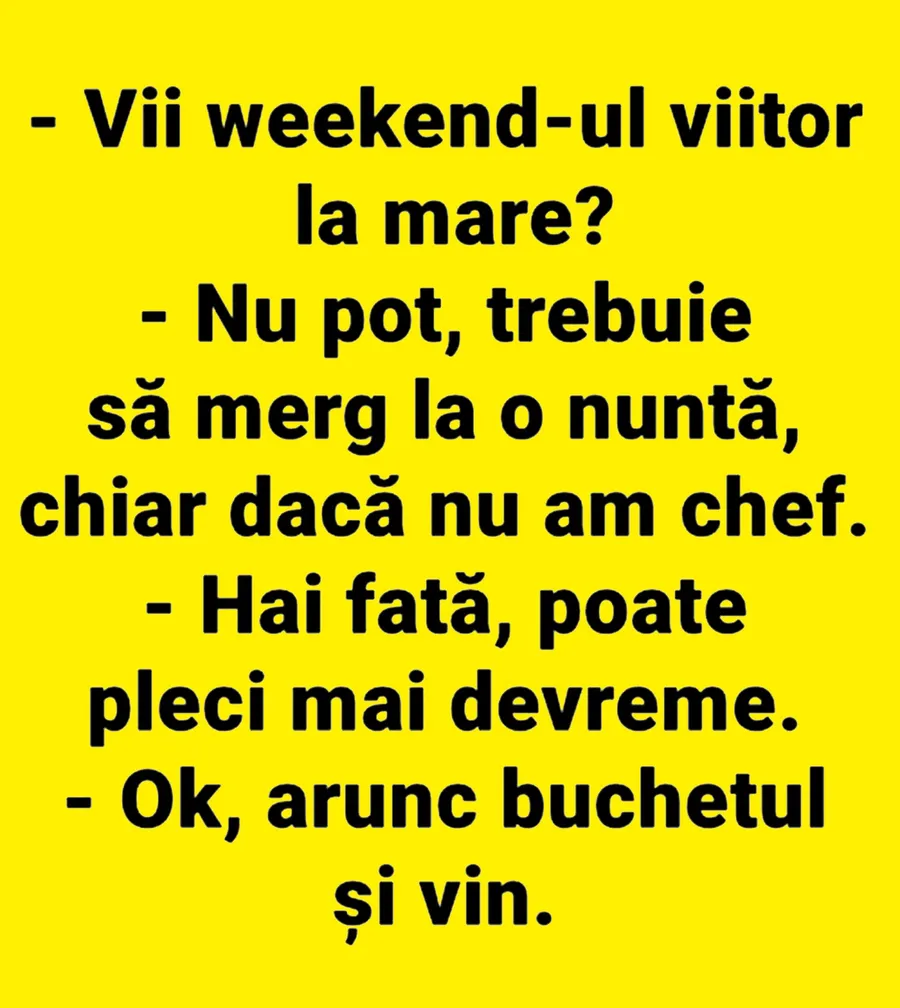 – Nu pot, trebuie să merg la o nuntă, chiar dacă nu mai am chef.