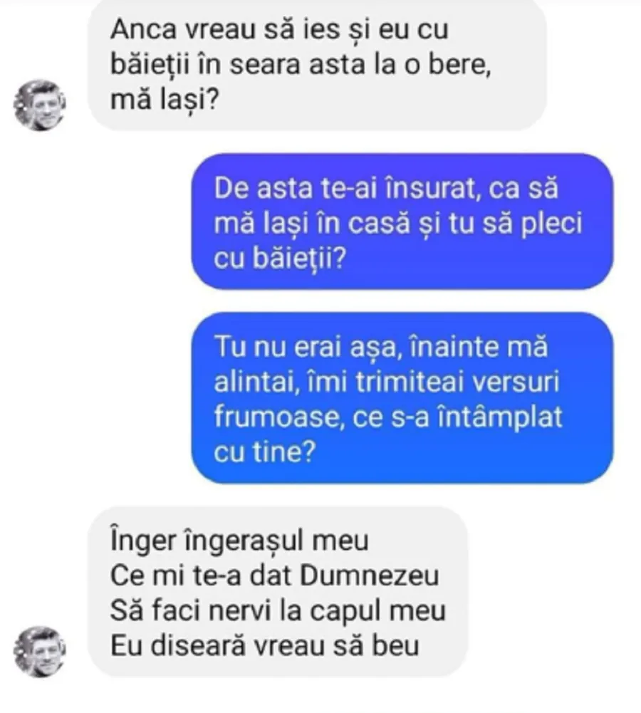 -De asta te-ai însurat, ca să mă lași în casă și tu să pleci cu băieții. Tu nu erai așa, înainte mă alintai, îmi trimiteai versuri frumoase, ce s-a întâmplat cu tine?