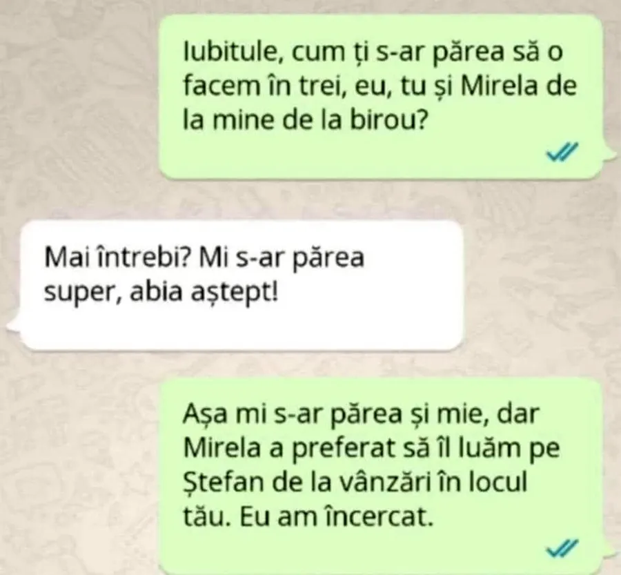 – Iubitule, cum ți s-ar părea să o facem în trei, eu, tu și Mirela de la mine de la birou?