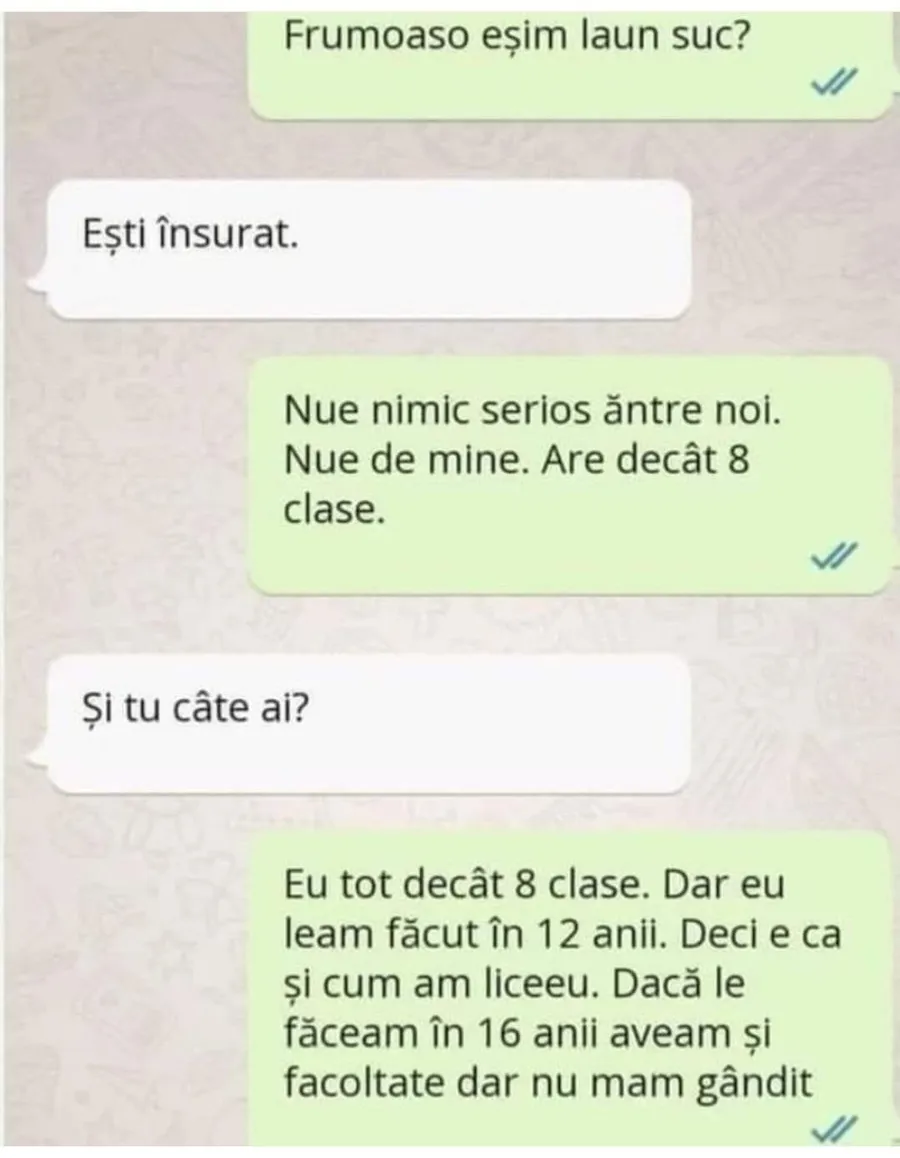– Eu tot 8 clase. Dar eu leam făcut în 12 anii. Deci e ca și cum am liceeu. Dacă le făceam în 16 anii aveam și facoltate dar nu mam gândit.