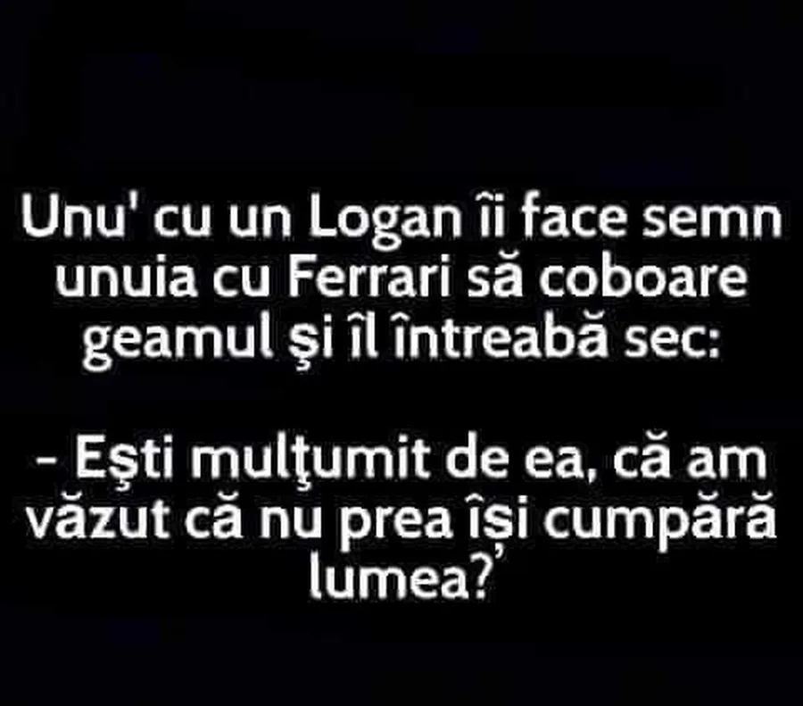„Unu` cu un Logan îi face semn unuia cu un Ferrari să coboare geamul și îl întreabă sec: