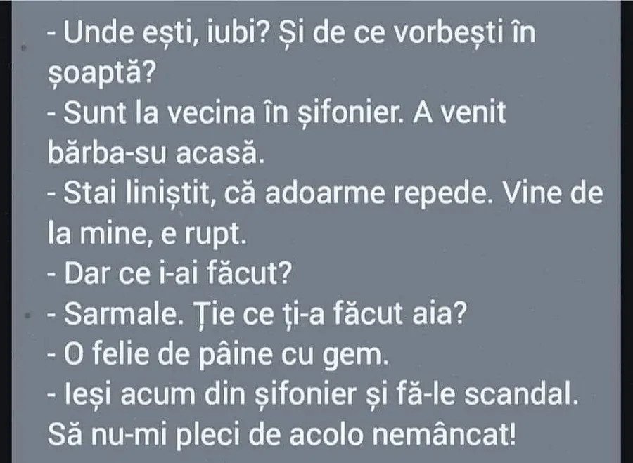– Ieși acum din șifonier și fă-le scandal. Să nu-mi pleci de acolo nemâncat!
