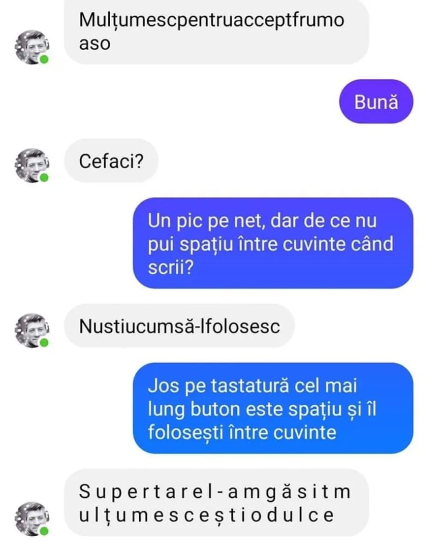 -Un pic pe net, dar de ce nu pui spațiu între cuvinte când scrii?