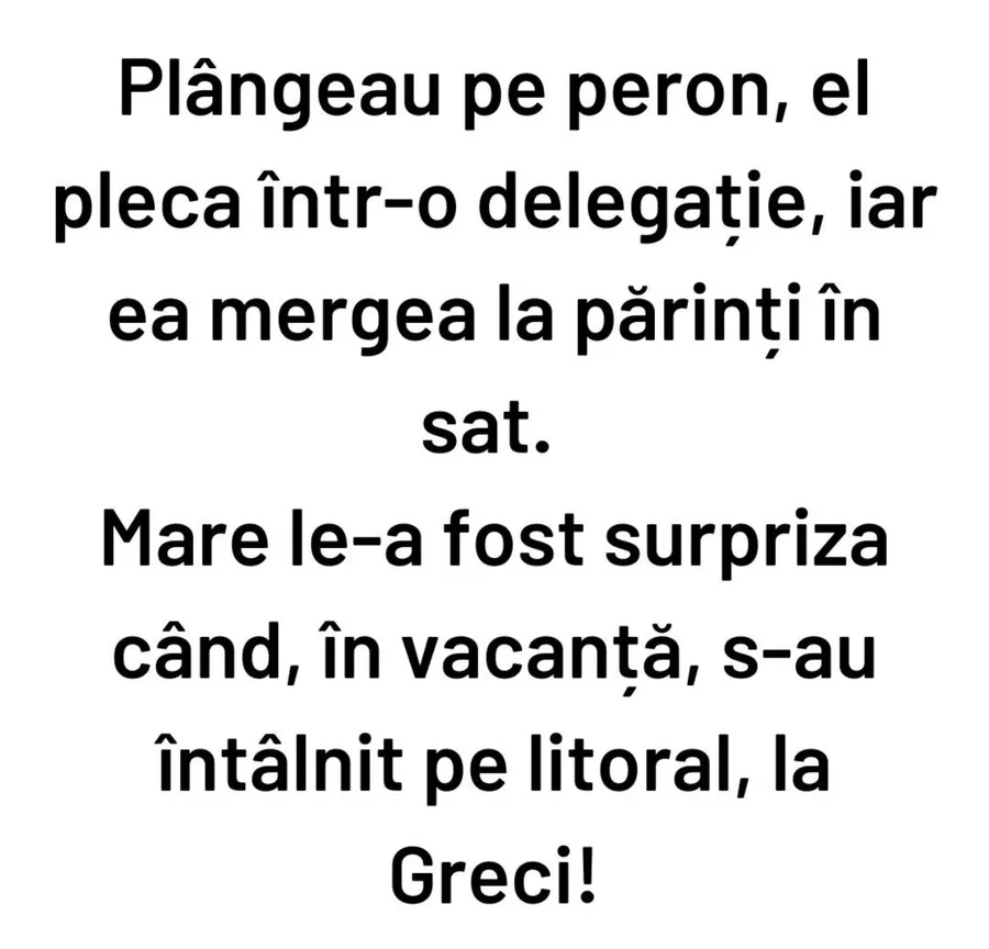 ”Plângeau pe peron, el pleca într-o delegație, iar ea mergea la părinți în sat. Mare le-a fost surpriza când, în vacanță, s-au întâlnit pe litoral, la greci”, este bancul zilei.