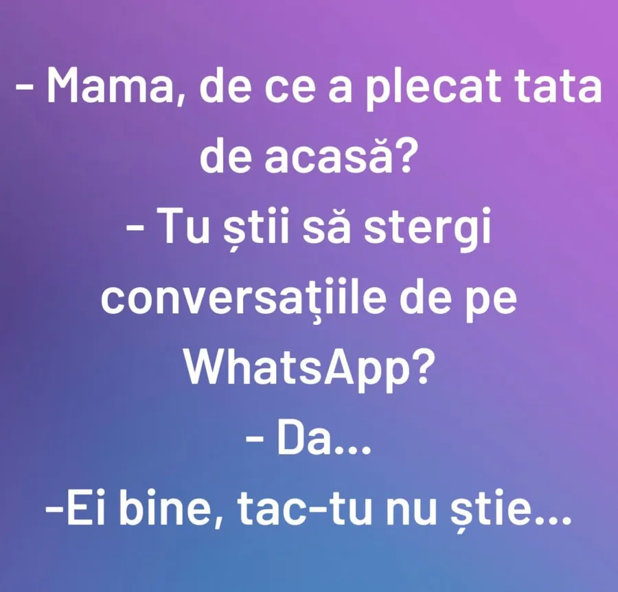 Ziua bună se cunoaște încă de dimineață, așa că trebuie începută cu zâmbetul pe buze. Iar pentru asta am pregătit un banc care cu siguranță te va amuza copios. Protagoniștii sunt o mamă și un fiu care vorbesc despre lipsa tatălui de acasă. Deznodământul este hilar.