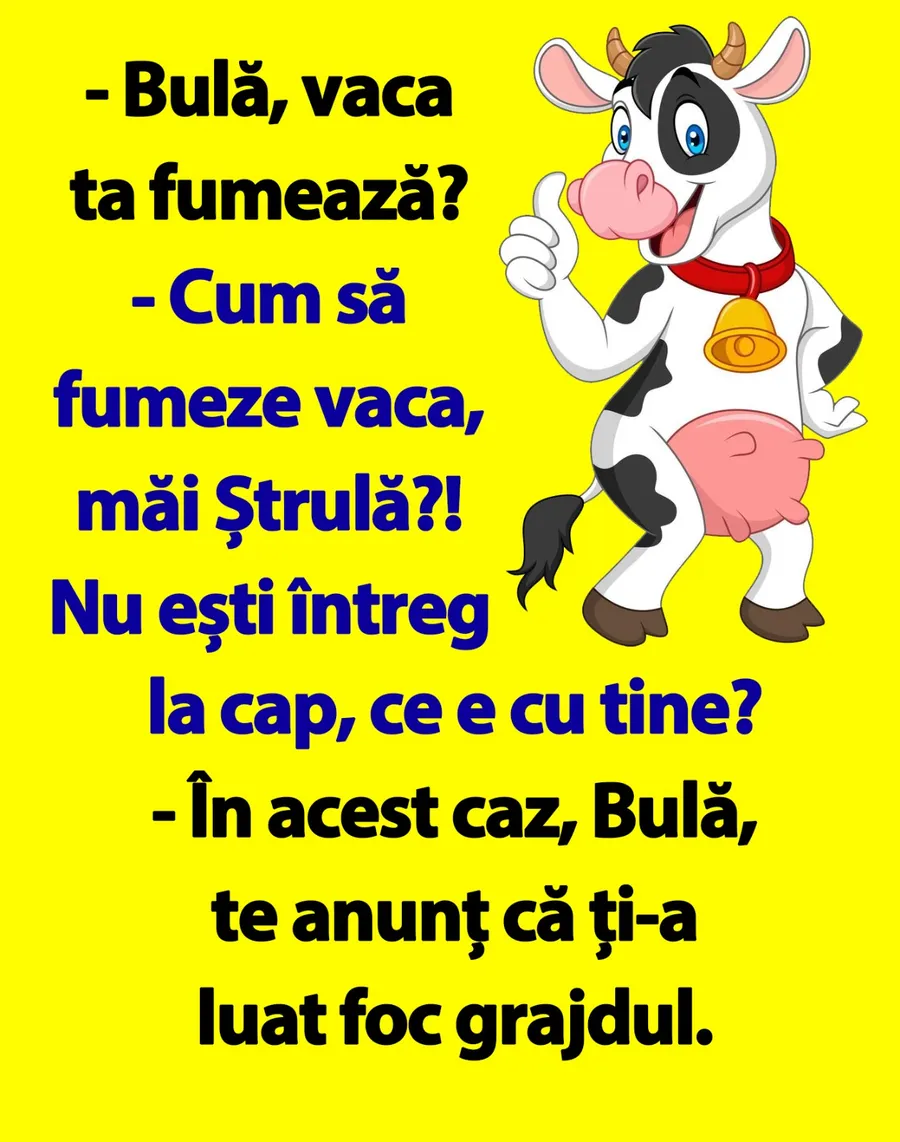 – Cum să fumeze vaca, măi Ștrulă?! Nu ești întreg la cap, ce e cu tine?