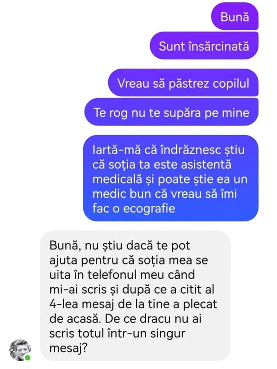 Bună, nu știu dacă te pot ajuta pentru că soția mea se uită în telefonul meu când mi-ai scris și după ce a citit al 4-lea mesaj de la tine, a plecat de acasă. De ce dracu nu ai scris totul într-un singur mesaj”.