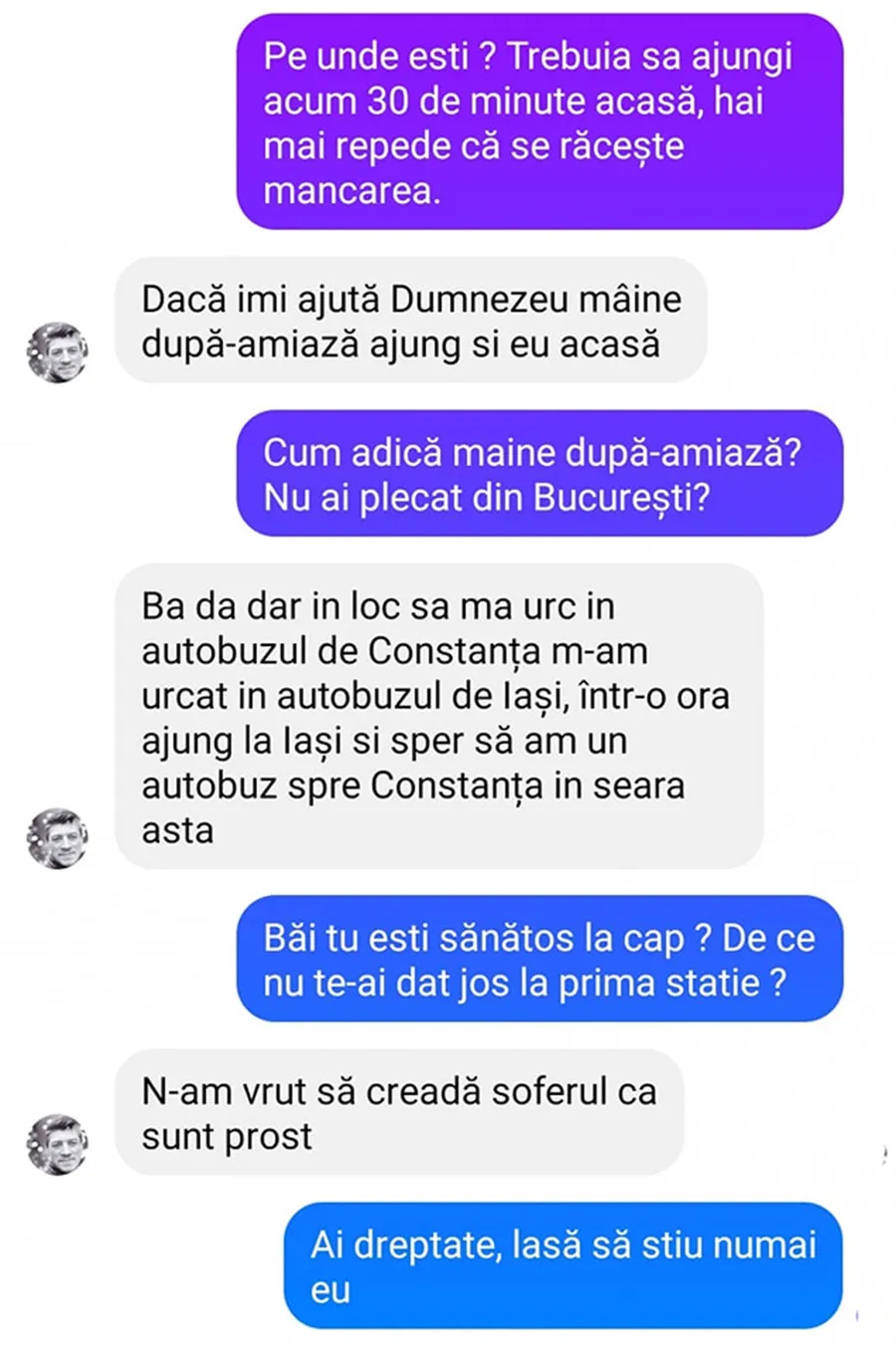 – Ba da, dar în loc să mă urc în autobuzul de Constanța, m-am urcat în autobuzul de Iași. Într-o oră ajung la Iași și sper să am un autobuz spre Constanța în seara asta.
