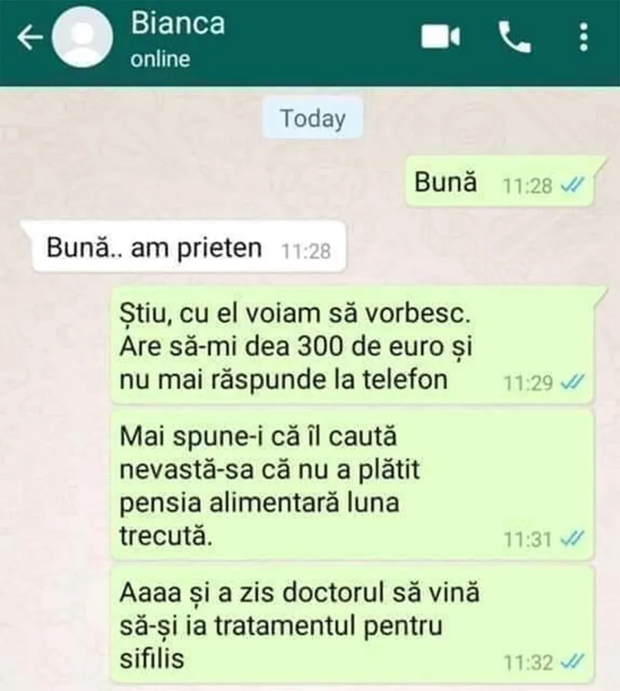 – Știu, cu el voiam să vorbesc. Are să-mi dea 300 de euro și nu mai răspunde la telefon. Mai spune-i că îl caută nevastă-sa că nu a plătit pensia alimentară luna trecută. Aaaa și a zis doctorul să vină să-și ia tratamentul pentru sifilis.
