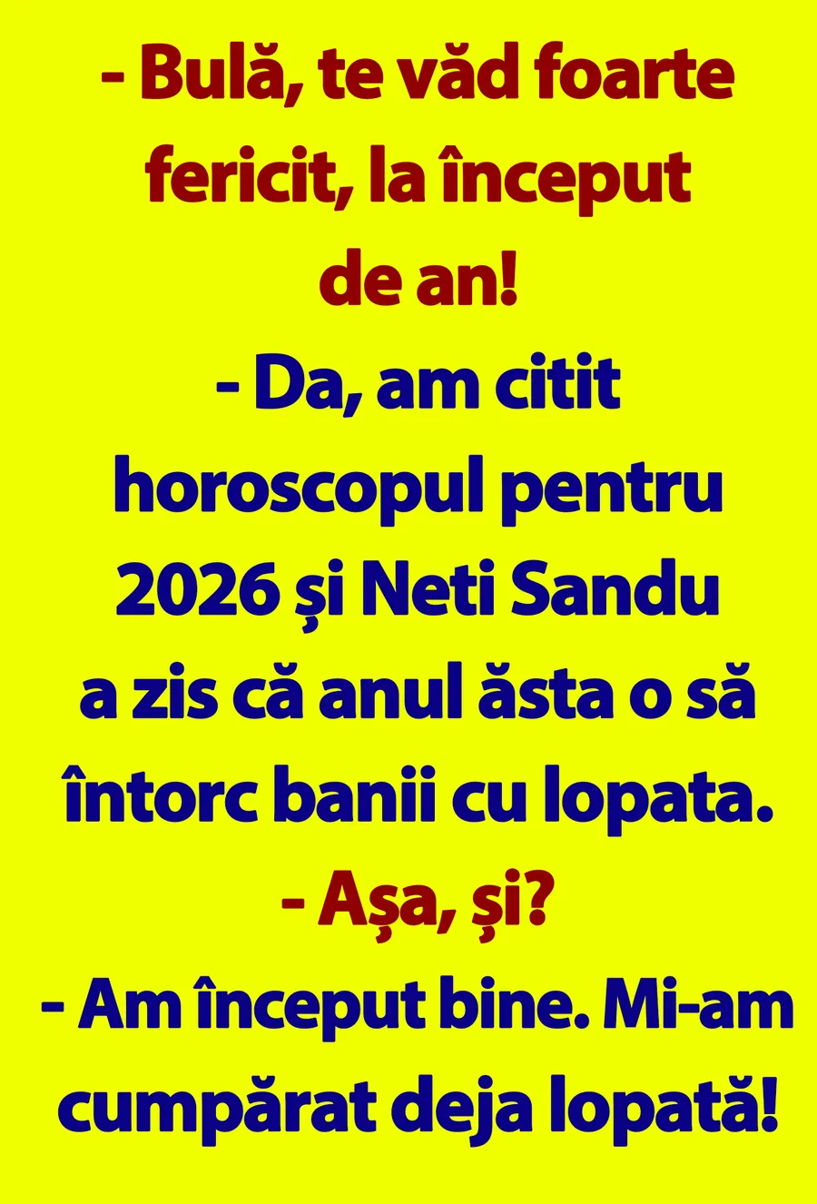 – Da, am citit horoscopul pentru 2026 și Neti Sandu a zis că anul ăsta o să întorc banii cu lopata.