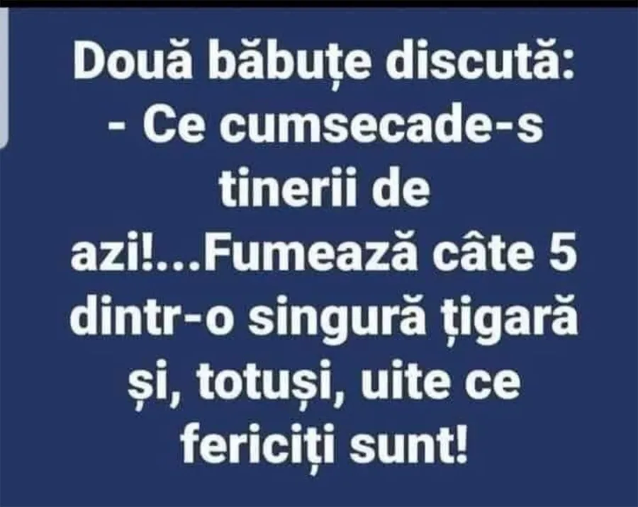 – Ce cumsecade-s tinerii de azi! Fumează câte 5 dintr-o singură țigară și, totuși, uite ce fericiți sunt!