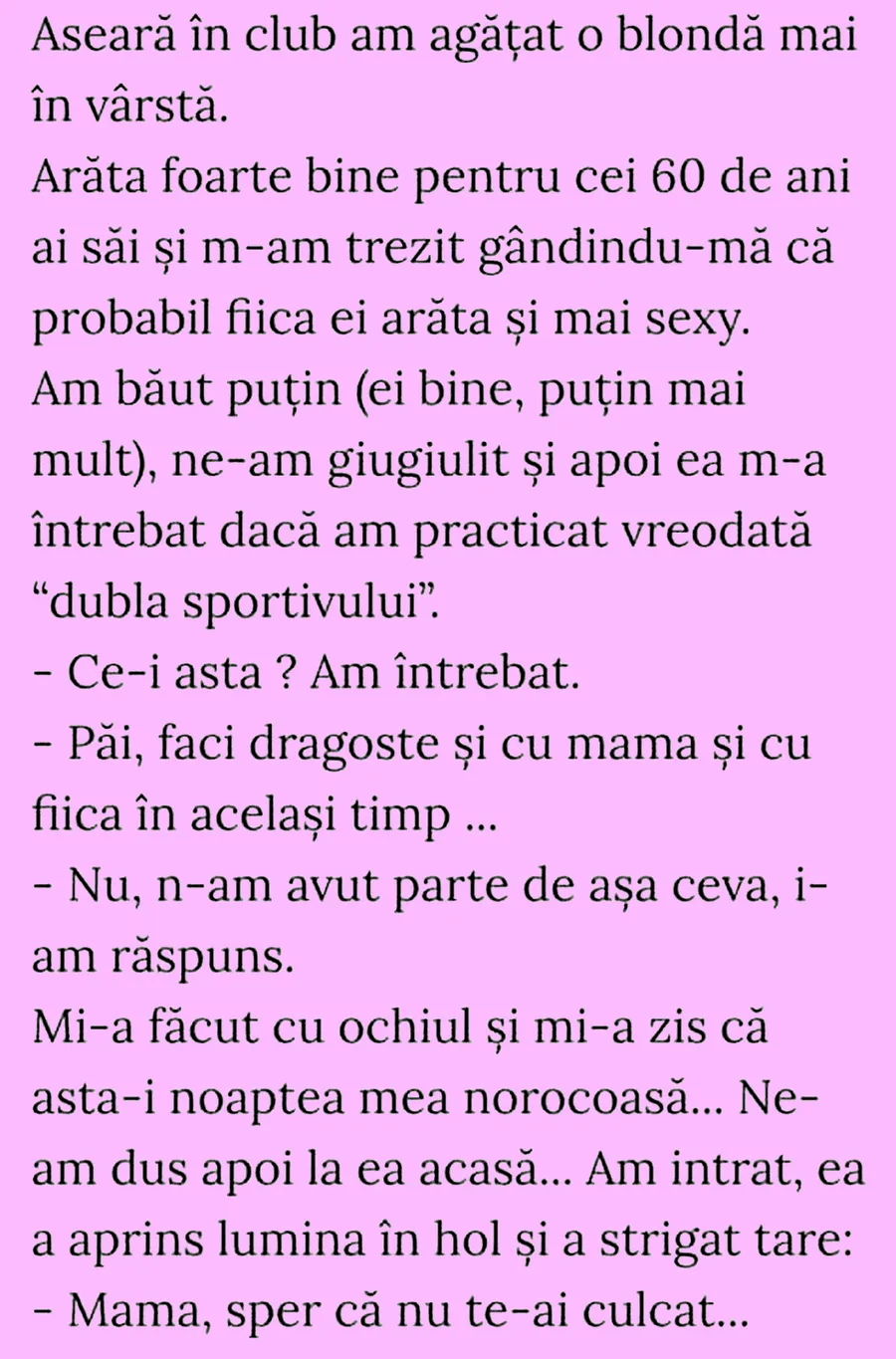 -Aseară în club am agățat o blondă mai în vârstă. Arăta foarte bine pentru cei 60 de ani ai săi și m-am trezit gândindu-mă că probabil fiica ei arăta și mai sexy. Am băut puțin (ei bine, puțin mai mult), ne-am giugiulit și apoi ea m-a întrebat dacă am practicat vreodată ”dubla sportivului”.