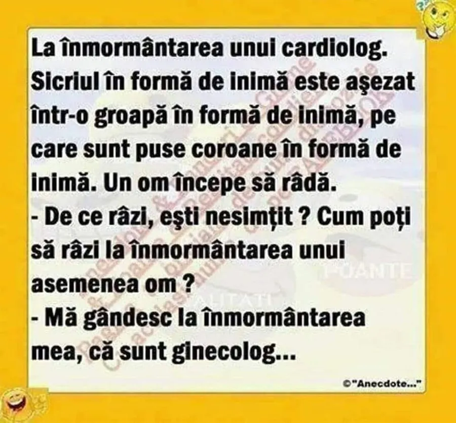 La înmormântarea unui medic cardiolog, un bărbat nu-și poate stăpâni râsul atunci când observă că sicriul, groapa, dar și coroanele de flori sunt în formă de inimă. Mustrat de cineva pentru comportamentul său neadecvat, bărbatul oferă o replică fabuloasă.