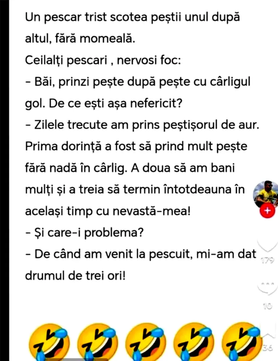 – Zilele trecute am prins peștișorul de aur. Prima dorință a fost să prind mai mult pește fără nadă în cârlig. A doua să am bani mulți și a treia să termin întotdeauna în același timp cu nevastă-mea.