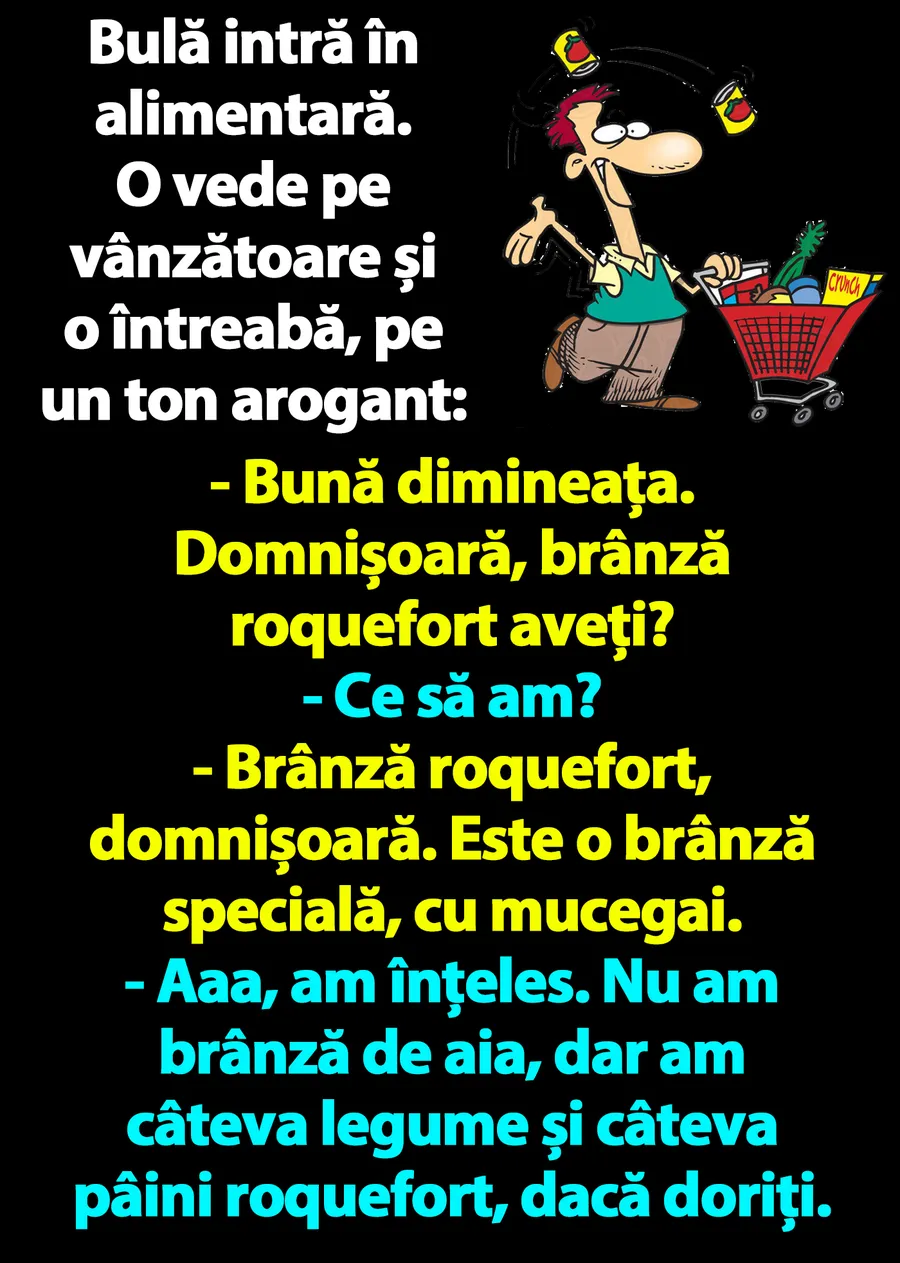 Bancul dimineții | Bulă intră în alimentară: „Brânză roquefort aveți?”