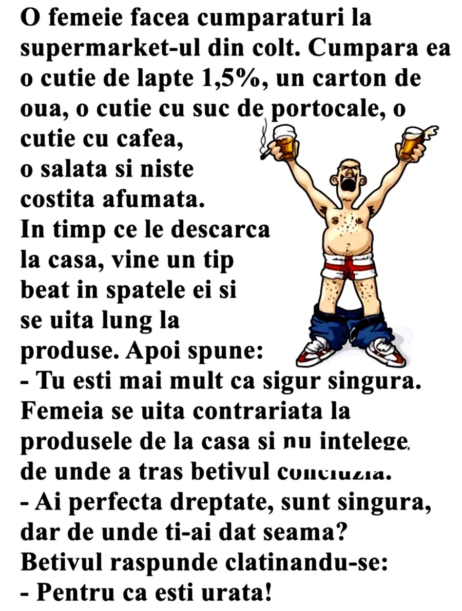 „O femeie făcea cumpărături la supermarketul din colț. Cumpără ea o cutie de lapte 1,5% , un carton de ouă, o cutie cu suc de portocale, o salată și niște costiță afumată. În timp ce le descarcă la casă, vine un tip beat în spatele ei și se uită lung la produse. Apoi spune: