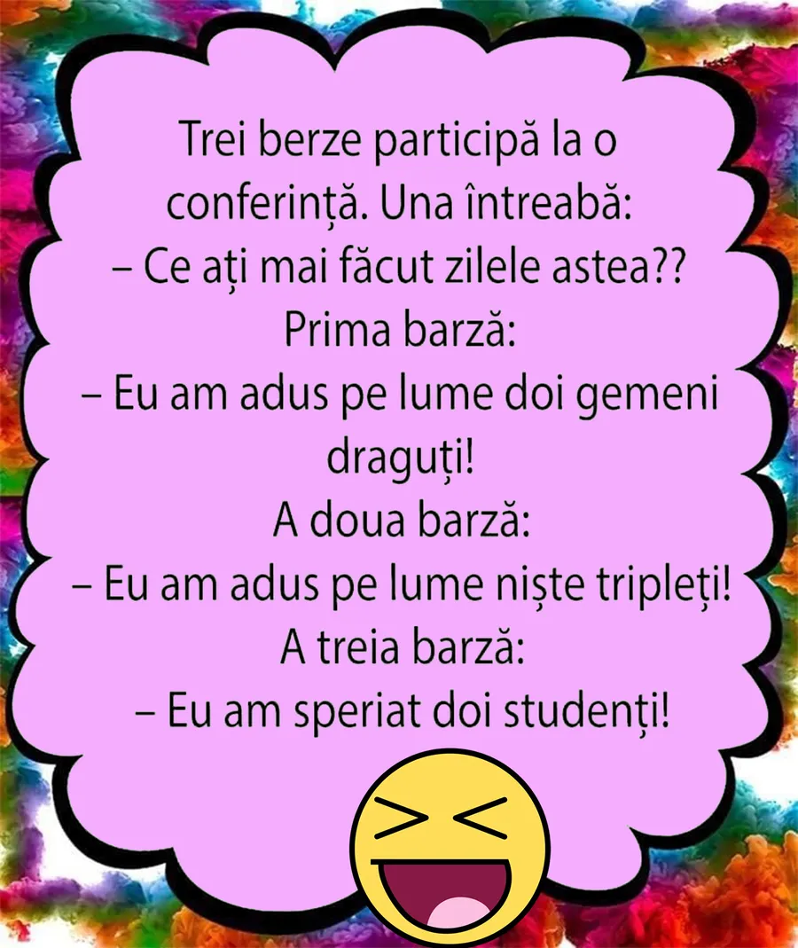Bancul acestei zile redă discuția amuzantă dintre trei berze, care își povestesc peripețiile prin care au trecut în ultima perioadă. În timp ce două dintre ele se laudă că au adus pe lume pui, cea de a treia a avut cu totul alte preocupări. Râsul este garantat!