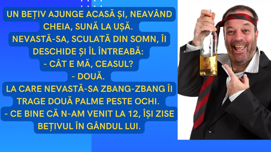 Bancul dimineții. Un bărbat, amețit bine de aburii alcoolului, ajunge acasă, la nevastă. Sună la ușă, pentru că nu avea cheia, și îi deschide soția. Partenera îl ia la întrebări, văzând că este trecut de miezul nopții. Reacția soției este de milioane! Spor la râs!