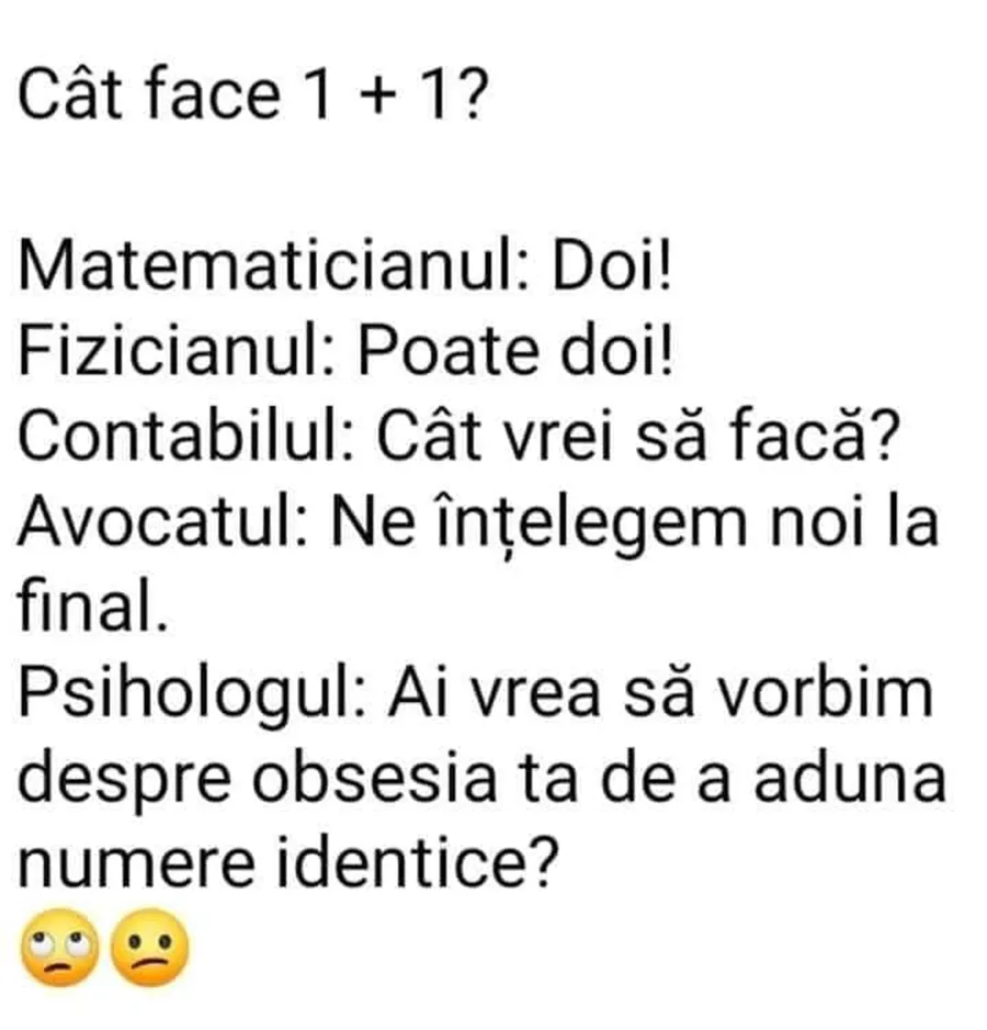O nouă zi, o nouă glumă! Vă prezentăm bancul începutului de an, care vă va aduce zâmbetul pe față. Întrebarea capcană este „Cât face 1+1?”, iar un matematician, un fizician, un contabil, un avocat și un psiholog sunt puși la încercare. Ești pregătit/ă pentru o porție de râs? Hai să dăm drumul distracției!