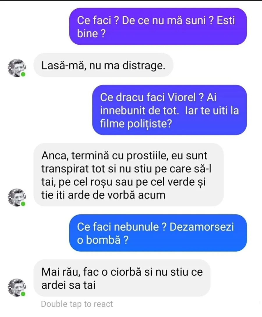 – Anca, termină cu prostiile, eu sunt transpirat tot și nu știu pe care să-l tai, pe cel roșu sau pe cel verde și ție îți arde de vorbă acum.