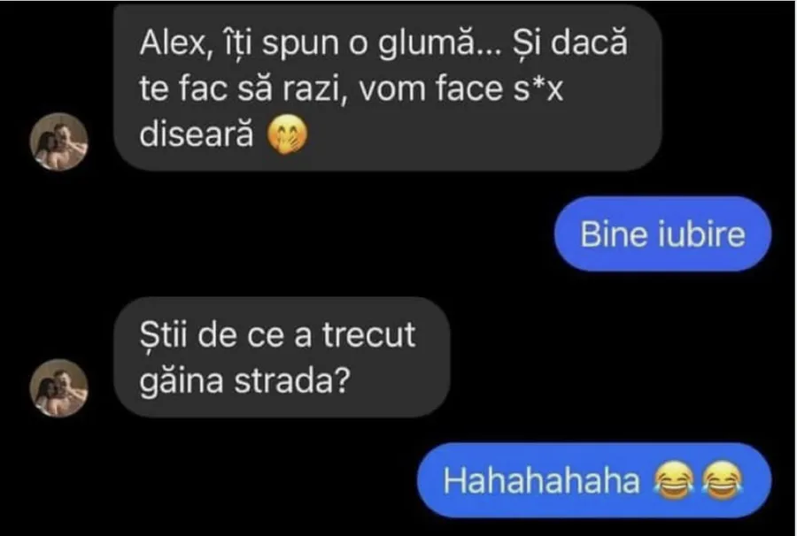 – Alex, îți spun o glumă… și dacă te fac să râzi, vom face s*x diseară.