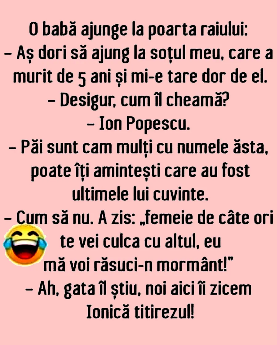 Nu trebuie să treacă nicio zi fără o porție copioasă de râs, iar pentru asta am pregătit un banc care cu siguranță o să te amuze copios. Protagonista de azi este o bătrână care ajunge în Rai și încearcă să își găsească soțul. Deznodământul este hilar.