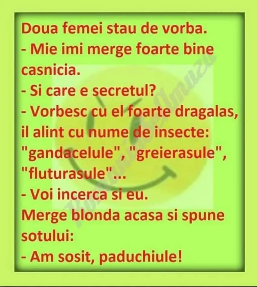 Un început de săptămână perfect nu poate fi marcat altfel decât printr-o doză de umor. De aceea, CANCAN.RO pune la dispoziția cititorilor săi un banc amuzant, care va înveseli ziua oricui. Iată secretul unei căsnicii reușite.