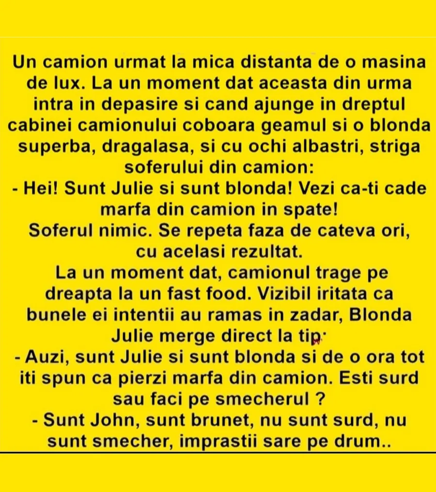 Șoferul nimic. Se repetă faza de câteva ori, cu același rezultat. La un moment dat, camionul trage pe dreapta la un fast food. Vizibil iritată că bunele ei intenții au rămas în zadar, blonda Julie merge direct la tip.-Auzi, sunt Julie și sunt blondă și de o oră tot îți spun că pierzi marfa din camion. Ești surd sau faci pe șmecherul?