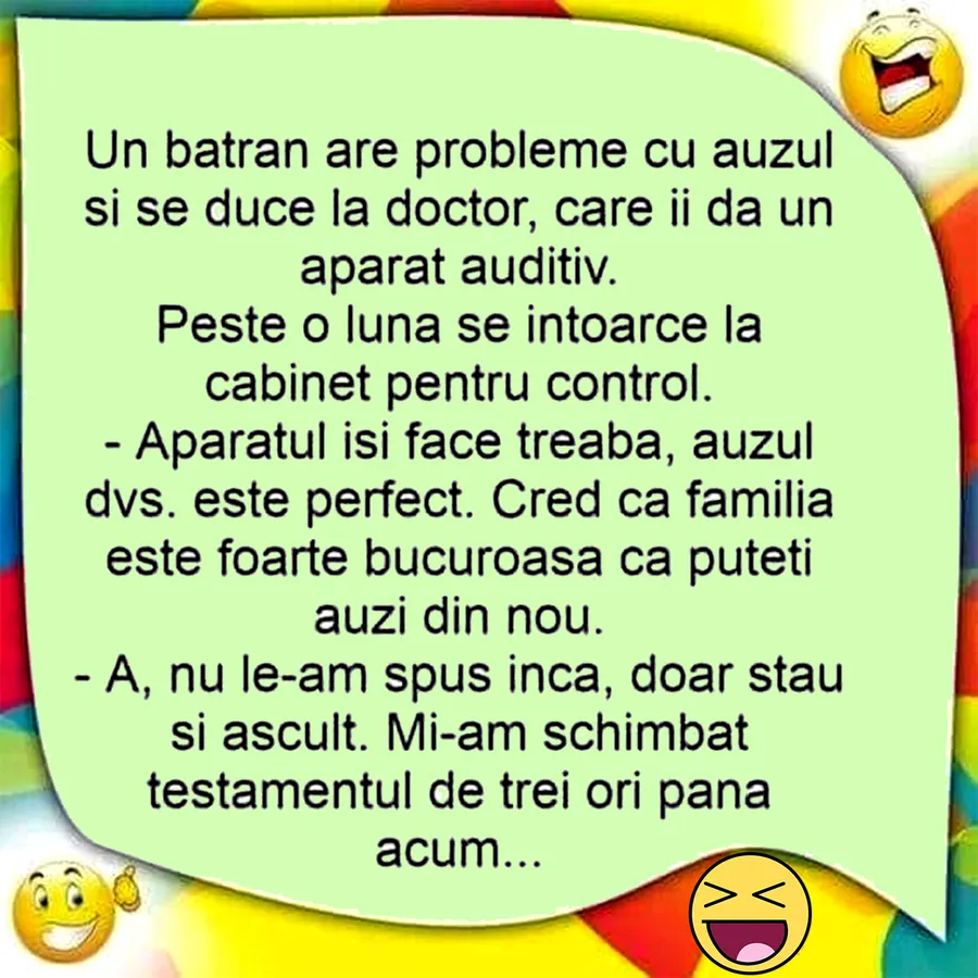 Bancul începutului de săptămână. Un bătrân decide să își pună un aparat auditiv. La o lună distanță, se întoarce la medic, pentru a fi supus unui control. Dialogul dintre pacient și doctor stârnește amuzamentul. Spor la râs!