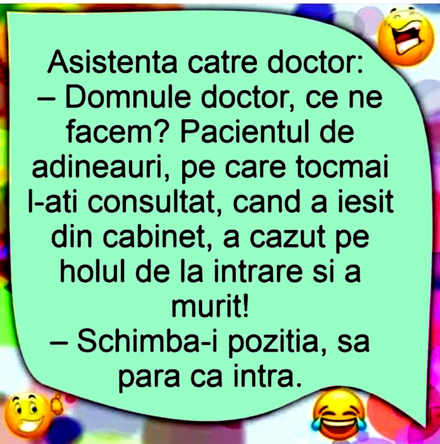 – Domnule doctor, ce ne facem? Pacientul de adineauri, pe care tocmai l-ați consultat, când a ieșit din cabinet, a căzut pe holul de la intrare și a murit!