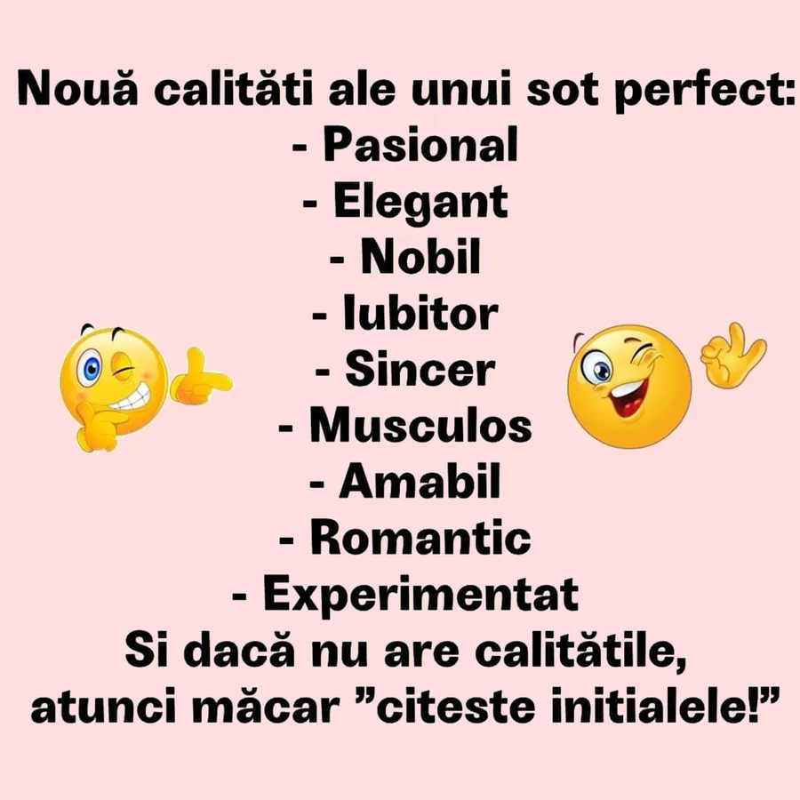 Este weekend, este zi de relaxare și voie bună. Startul îl dăm cu un banc, care cu siguranță o să te amuze copios. Astăzi vorbim despre calitățile pe care trebuie să le aibă soțul perfect. Deznodământul este hilar.