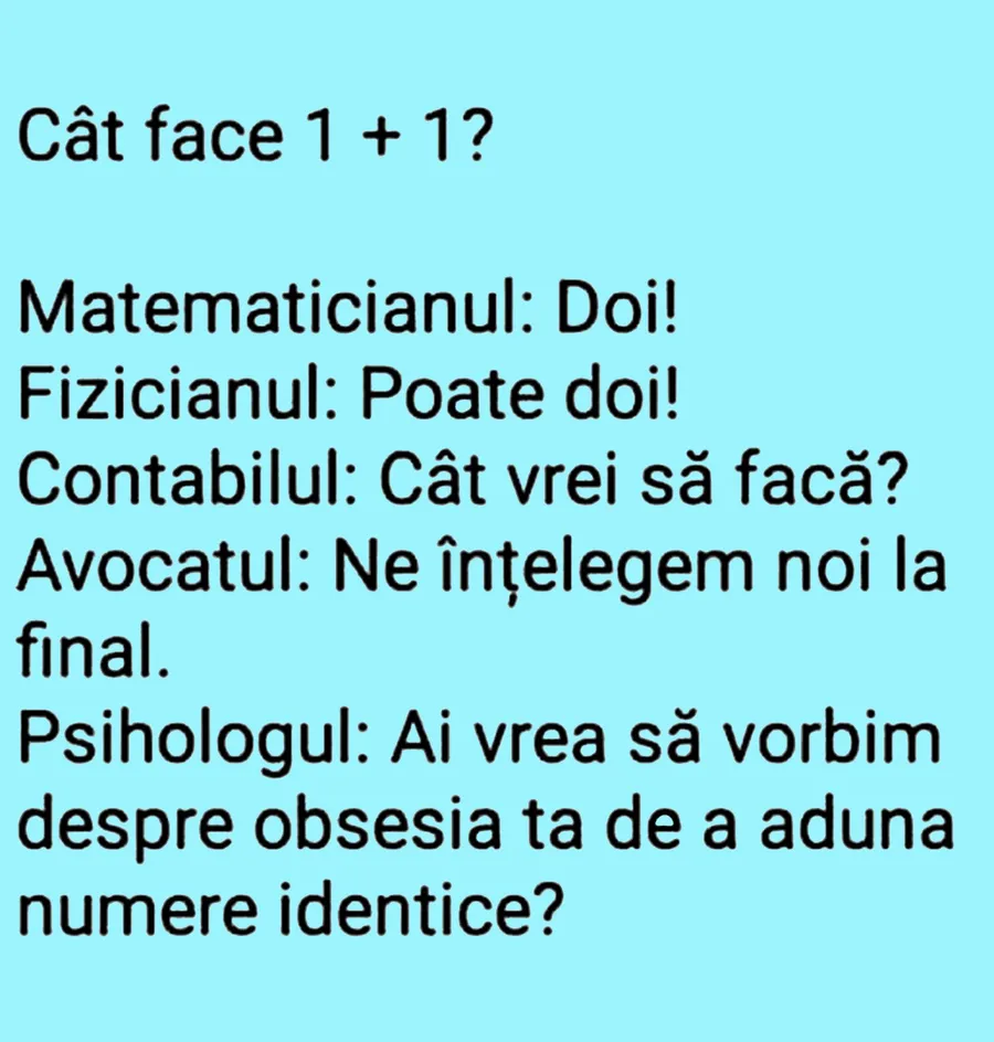 Nu trebuie să treacă nicio zi fără o porție copioasă de râs, iar pentru asta am pregătit un banc care cu siguranță o să te amuze copios. Astăzi se pune în discuție o operație matematică simplă, la care există mai multe răspunsuri, aparent. Deznodământul este hilar.