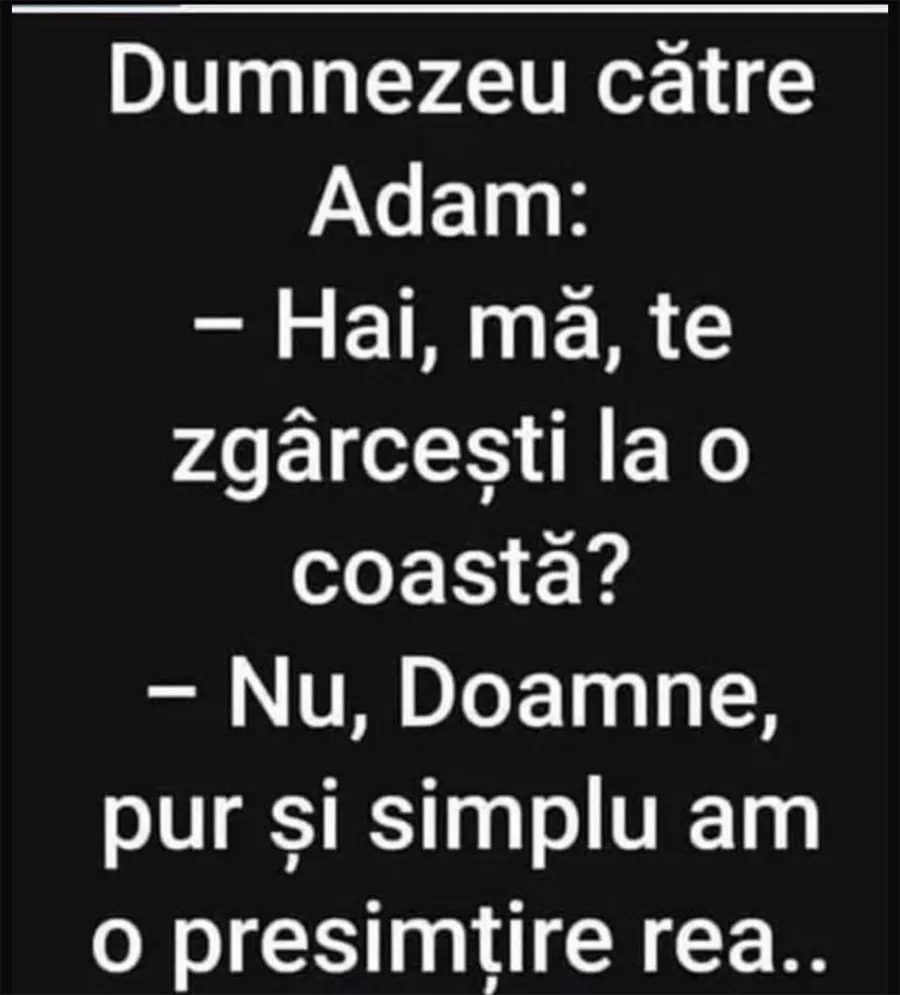 Dragă cititorule, CANCAN.RO ți-a pregătit un bancul sfârșitului de săptămână. Discuția dintre Dumnezeu și Adam te va face să râzi cu gura până la urechi. Spor și voie bună!