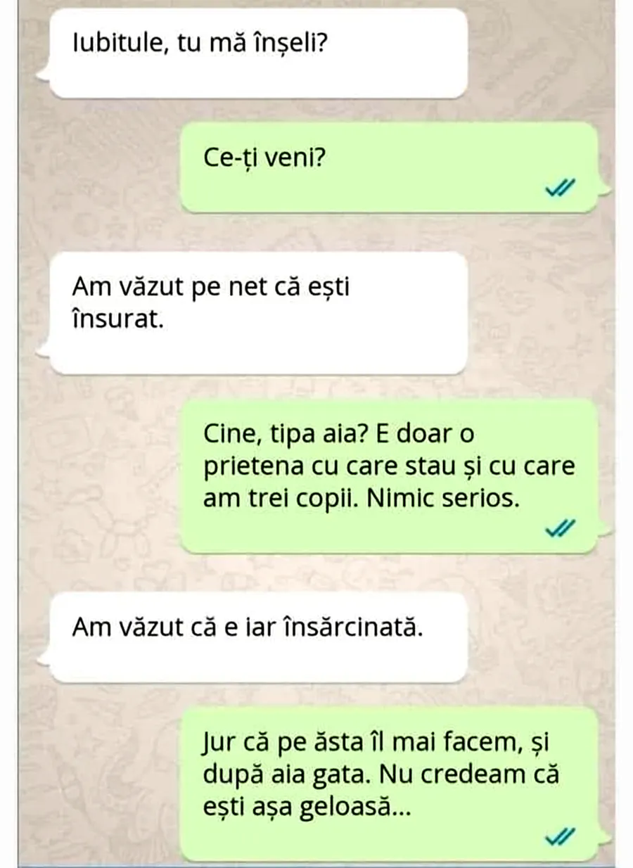 CANCAN.RO îți prezintă bancul sfârșitului de săptămână! O să râzi cu lacrimi atunci când vei vedea conversația dintre o tânără și iubitul ei. Ce reacție a avut atunci când a aflat că, de fapt, partenerul ei este însurat și are copii.