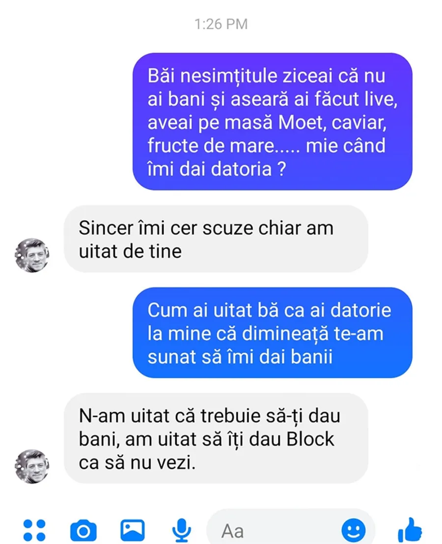 – N-am uitat că trebuie să-ți dau bani, am uitat să îți dau block ca să nu vezi.