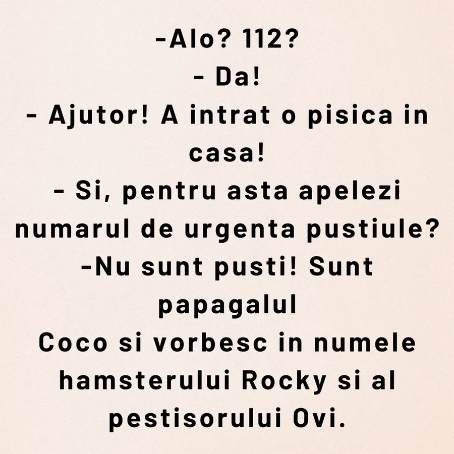 Nu trebuie să treacă nicio zi fără o porție copioasă de râs, iar pentru asta am pregătit un bac care cu siguranță o să te amuze copios. Protagonistul de astăzi este papagalul Coco. Acesta suna la 112, iar deznodământul este hilar.