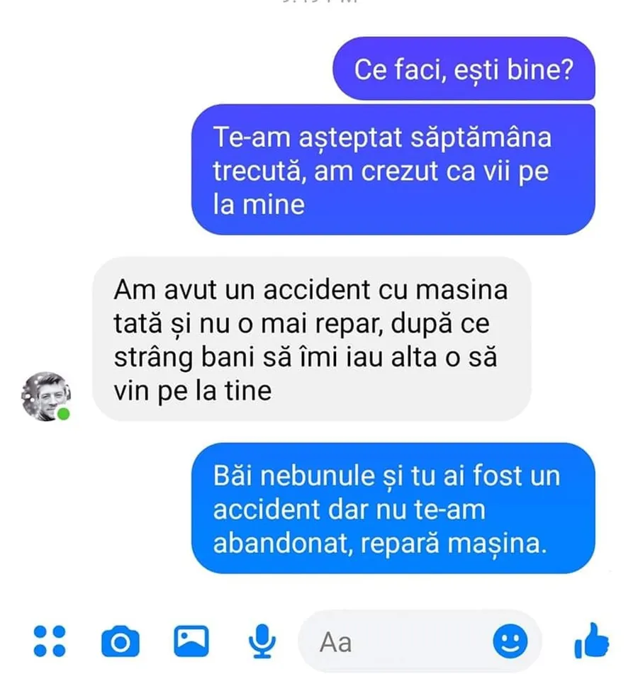 – Am avut un accident cu mașina tată și nu o mai repar, după ce stâng bani să îmi iau alta o să vin pe la tine.