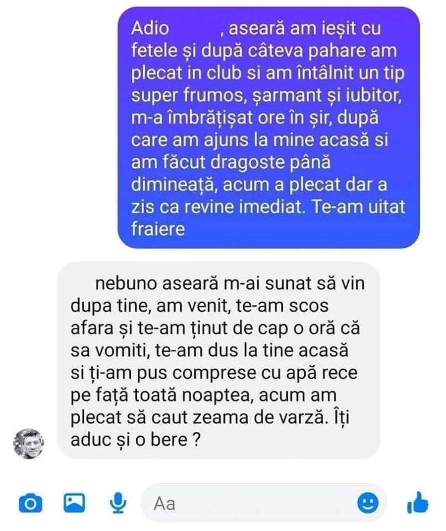 -Nebuno, aseară m-ai sunat să vin după tine, am venit, te-am scos afară și te-am ținut de cap o oră ca să vomiți, te-am dus la tine acasă și ți-am pus comprese cu apă rece pe față toată noaptea, acum am plecat să caut zeamă de varză. Îți aduc și o bere?