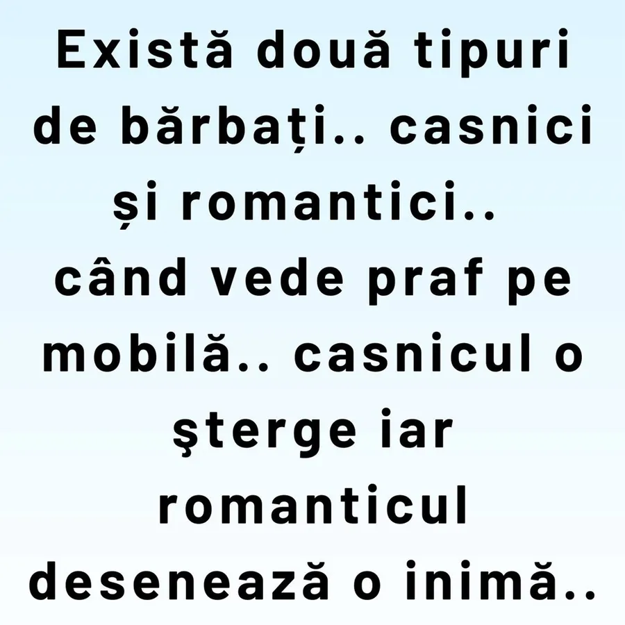 Există două tipuri de bărbați.. casnici şi romantici.. când vede praf pe mobilă.. casnicul o şterge, iar romanticul desenează o inimă..