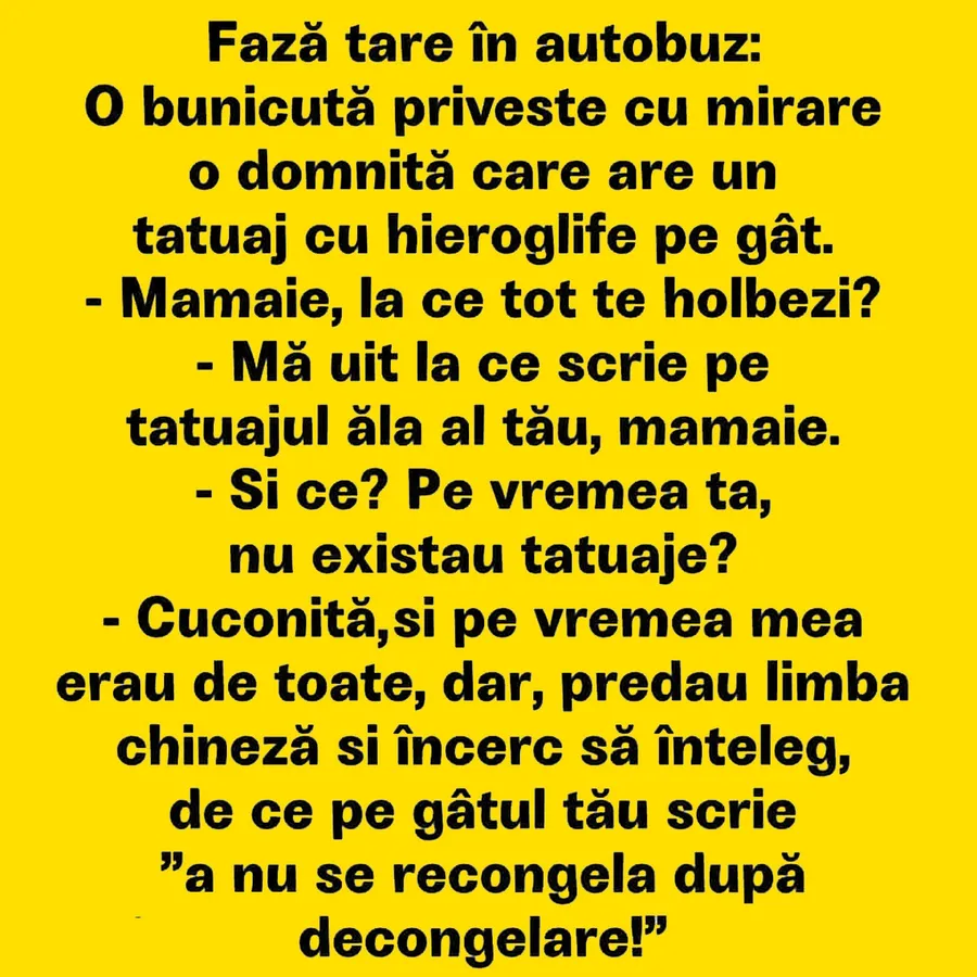 Bancul zilei! În această dimineață, vă mai încântăm cu un banc savuros. Pentru o zi plină de voie bună, trebuie să citiți cum decurge o conversație între o bunicuță și o domnișoară tatuată. Ești gata de distracție?