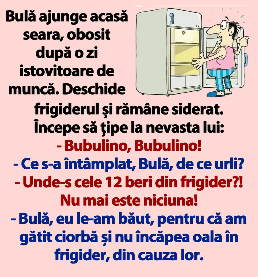 CANCAN.RO ți-a pregătit bancul zilei. Începe ziua cu zâmbetul pe buze și vezi ce se întâmplă când Bulă ajunge acasă, obosit după o zi grea la muncă și nu găsește nicio bere în frigider.