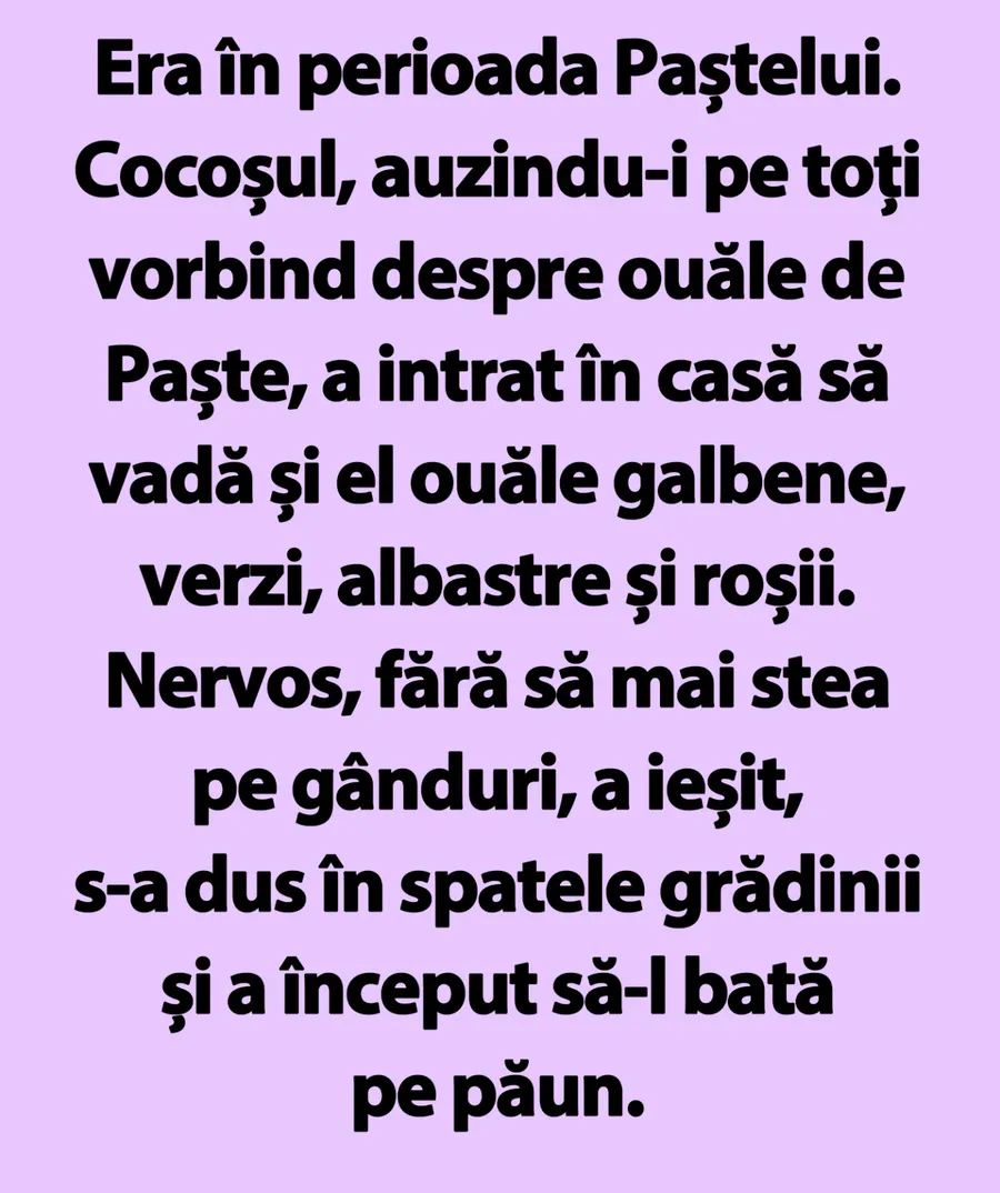 Era în perioada Paștelui. Cocoșul, auzindu-i pe toți vorbind despre ouăle de Paște, a intrat în casă să vadă și el ouăle galbene, verzi, albastre și roșii. Nervos, fără să mai stea pe gânduri, a ieșit, s-a dus în spatele grădinii și a început să-l bată pe păun.