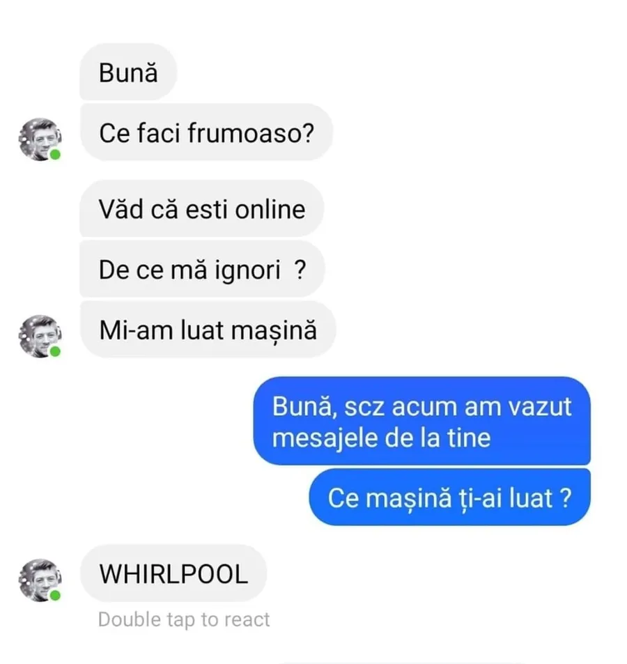 – Bună! Ce faci frumoaso? Văd că ești online. De ce mă ignori? Mi-am luat mașină.