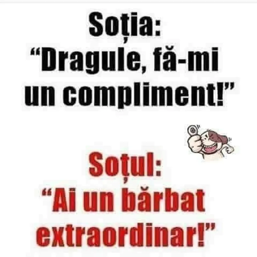Nu trebuie să treacă nicio zi fără o porție copioasă de râs, iar pentru asta am pregătit un banc care cu siguranță o să te amuze copios. Protagonista de astăzi este o femeia care îi cere un compliment soțului ei. Deznodământul este hilar.