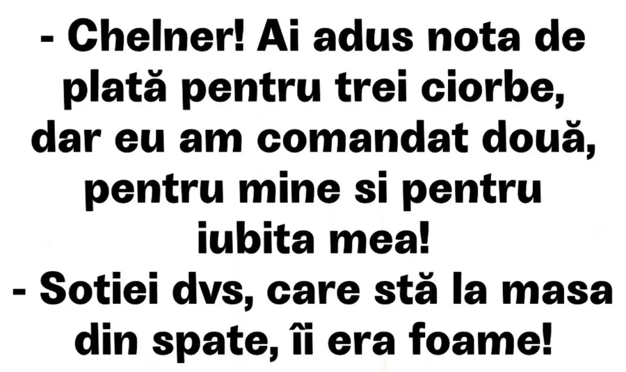 – Chelner! Ai adus nota de plată pentru trei ciorbe, dar eu am comandat două, pentru mine și pentru iubita mea!