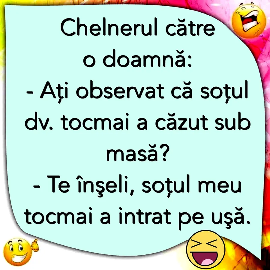 O nouă zi, o nouă glumă savuroasă! Dacă vrei să ai parte de o zi plină de râsete și voie bună, atunci iată un banc amuzant ce-ți va aduce zâmbetul pe buze. Așadar, CANCAN.RO vă prezintă o glumă cu adevărat bună.